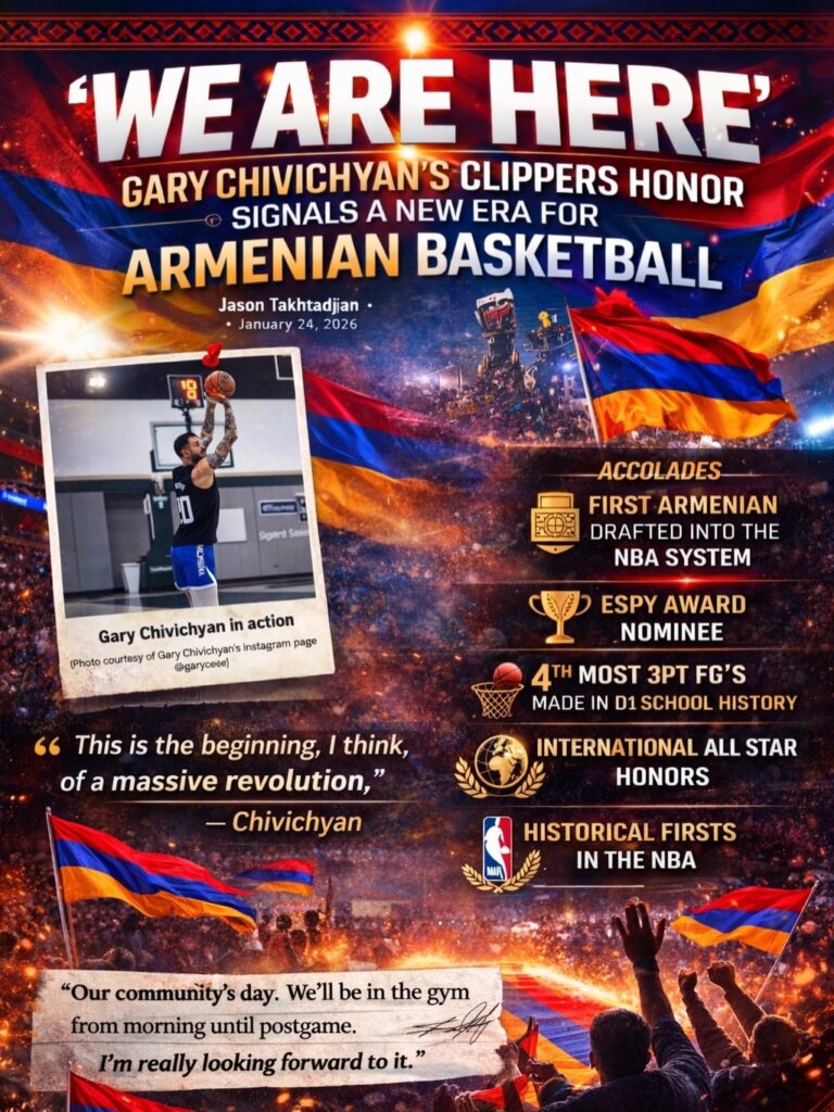 Armenian-American professional basketball player Gary Chivichyan will be honored at Intuit Dome, the home of the Los Angeles Clippers, on April 7, 2026 during Armenian Heritage Night, in front of…