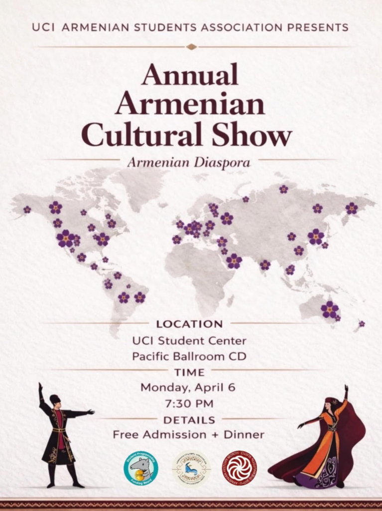 UCI Armenian Students Association presents the Annual Armenian Cultural Show 🇦🇲 Join us for a night celebrating the Armenian diaspora through culture, community, and tradition. 📍UCI Student Center, Pacific Ballroom…